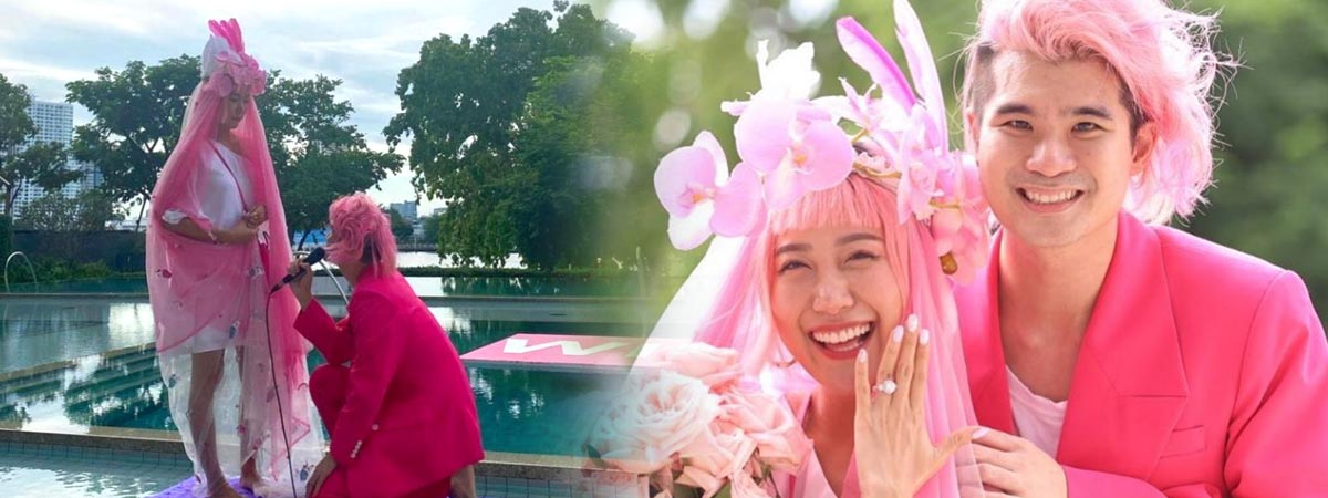 งานนี้โมเมนต์ขอแต่งงานสุดหวานยังอบอวลไปด้วยความรักของทั้งคู่ ที่ฝ่ายชายได้จัดชุดใหญ่พาเพื่อน ๆ มาร่วมเซอร์ไพรส์ในธีมสีชมพูหวานแหววเหมือนสีผมของทั้งคู่ ซึ่งเป็นสีโปรดของฝ่ายหญิง โดยยังมีโมเมนต์คุกเข่าขอแต่งงานและสวมแหวนที่ทำเอาเพื่อน ๆ ที่อยู่ในโมเมนต์น่ายินดีนั้นต่างส่งเสียงเฮไปตาม ๆ กัน
