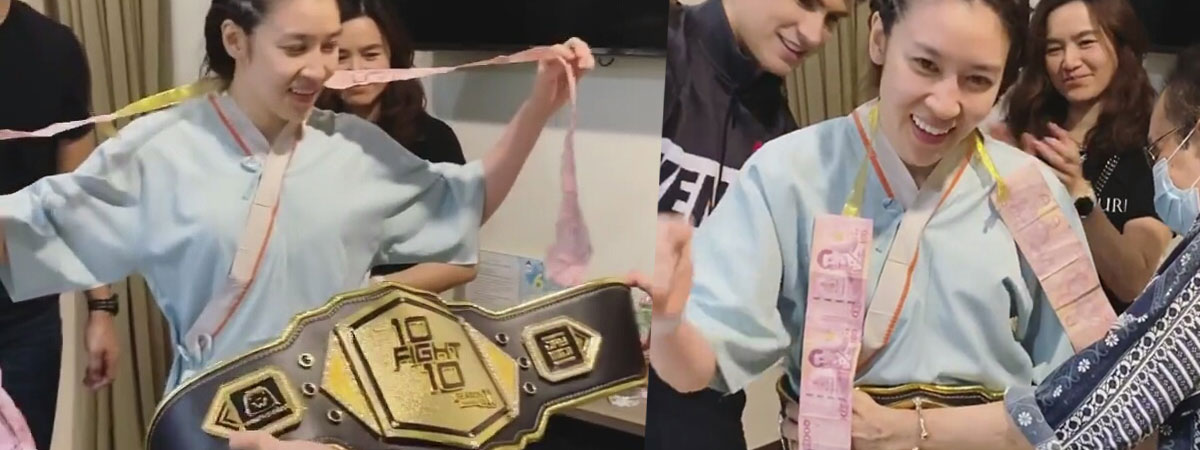 เชียร์ ฑิฆัมพร ถึงกับลุกจากเตียง หลังโค้ชอองตวนและกองเชียร์ทีมดำ 10 Fight 10 ยกเข็มขัดแชมป์พร้อมพวงมาลัยมาให้ถึงที่