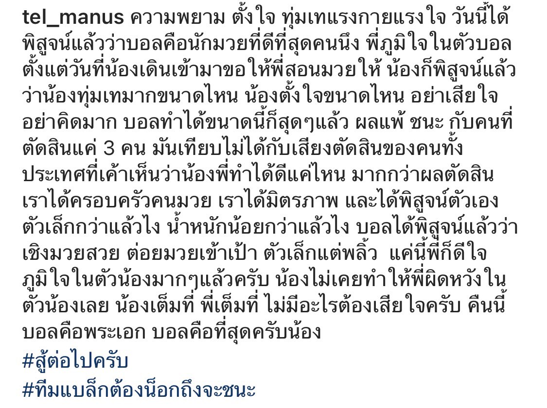 ด้าน ครูมนัส ครูมวยจากทีม Black บอกว่า ความพยายามของบอลในวันนี้ ได้พิสูจน์ตัวบอลแล้ว ตนภูมิใจในตัวบอลมาก บอลทุ่มเท ตั้งใจ และทำดีที่สุดแล้ว ผลแพ้ชนะนั้นมันตัดสินกัน 3 คน เทียบไม่ได้กับที่คนดูทางบ้านเห็นว่าบอลทำได้ดีกว่าแค่ไหน บอลถึงจะตัวเล็กกว่า น้ำหนักน้อยกว่า แต่ต่อยเข้าเป้า ตัวพลิ้ว บอลทำเต็มที่แล้ว ไม่มีอะไรต้องเสียใจ และติดแฮชแท็กว่า ทีมแบล็กต้องชนะน็อกถึงจะชนะ