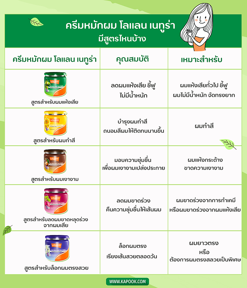 เมื่อลองใช้และเปรียบเทียบความแตกต่างระหว่าง ครีมนวด กับครีมหมักผม โลแลน เนทูร่า ด้วยการมองเห็น สัมผัส และฟังเสียง ภายในระยะเวลาเท่า ๆ กันแล้ว พบว่าผมฝั่งที่หมักด้วยครีมหมักผม โลแลน เนทูร่า มีความนุ่มลื่นกว่าอย่างเห็นได้ชัด เนื่องจากสามารถบำรุงเส้นผมให้นุ่มลื่นกว่าครีมนวดได้ถึง 5 เท่า สมกับที่เขาบอกไว้ รวมถึงช่วยให้ผมเงางาม มีน้ำหนัก และไม่พันกันหลังสระ เรียกว่าใช้แทนครีมนวดเดิมที่ใช้อยู่ได้เลยล่ะ และที่สำคัญยังเหมาะกับทุกสภาพเส้นผม มีให้เลือกด้วยกันถึง 5 สูตร หากอยากรู้ว่าสูตรไหนที่เหมาะกับสาว ๆ บ้างละก็ สามารถเช็กจากตารางด้านล่างแล้วไปหาซื้อกันได้ตามร้านค้าทั่วไป หรือเข้าไปดูรายละเอียดเพิ่มเติมที่ Lolane Official ได้เลยค่ะ