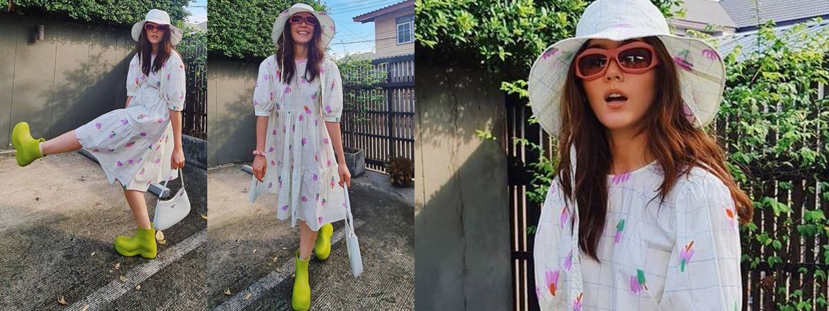 เช่นเดียวกับ รองเท้าบูตสีเขียวนีออน ที่สาวชมพู่สวมกับชุดเดรสสีขาว ที่โพสต์ลงบนอินสตาแกรม เมื่อวันที่ 21 พฤศจิกายน 2563 ซึ่งมองเผิน ๆ นั้นดูเหมือนรองเท้าบูตที่หาซื้อได้ทั่วไป แต่ความจริงแล้วไม่ใช่เลย