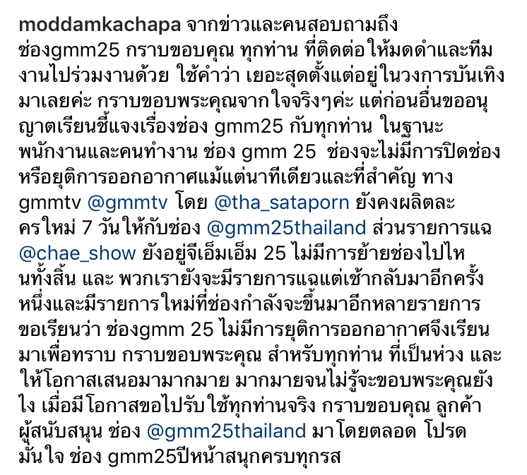 กราบขอบพระคุณสำหรับทุกท่านที่เป็นห่วง และให้โอกาสเสนอมามากมาย มากมายจนไม่รู้จะขอบพระคุณยังไง เมื่อมีโอกาสขอไปรับใช้ทุกท่าน กราบขอบคุณลูกค้า ผู้สนับสนุน ช่อง @GMM25thailand มาโดยตลอด โปรดมั่นใจช่อง GMM25 ปีหน้าสนุกครบทุกรส"
