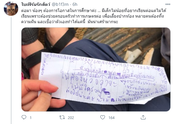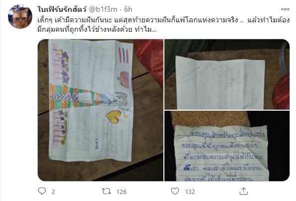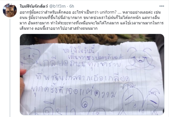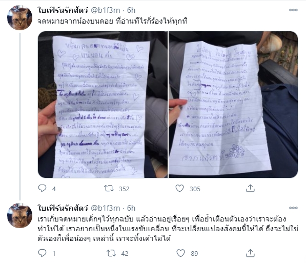 นอกจากนี้ ใบเฟิร์นยังได้เผยถึงจดหมายจากนักเรียนบนดอย ที่บางคนก็พูดว่าตัวเองเป็นเพียงเด็กเล็ก ๆ บนดอย และอยากทำให้ครอบครัวภาคภูมิใจ ได้เดินตามความฝันของตัวเอง และมีจดหมายชิ้นหนึ่งที่เขียนถึงคณะที่ไปช่วยเหลือน้อง ๆ บนดอยว่า "ขอให้วันนี้ เดินทางปลอดภัยนะคะ เกลียดถนนทุกครั้ง ที่พาฉันไกลจากเธอ เกลียดทุกครั้งที่ต้องเจอความเดียวดาย