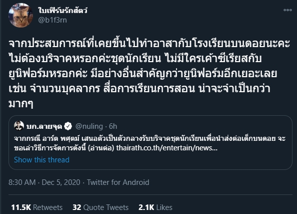 ล่าสุด (5 ธันวาคม 2563) ทางด้าน ใบเฟิร์น อัญชสา นักแสดงสาว ได้ออกมาแสดงความคิดเห็นเกี่ยวกับเรื่องนี้ โดยเธอเผยจากประสบการณ์ตรง ของตัวเธอเองที่เคยมีโอกาสขึ้นไปทำอาสากับโรงเรียนบนดอย โดยใบเฟิร์นบอกว่า ชุดนักเรียนไม่จำเป็นต้องบริจาคให้พวกเขา ไม่มีใครที่นั่นซีเรียสกับเครื่องแบบนักเรียน เพราะมีสิ่งอื่นที่สำคัญและจำเป็นกว่า เช่น จำนวนบุคลากร หรือสื่อการเรียนการสอน