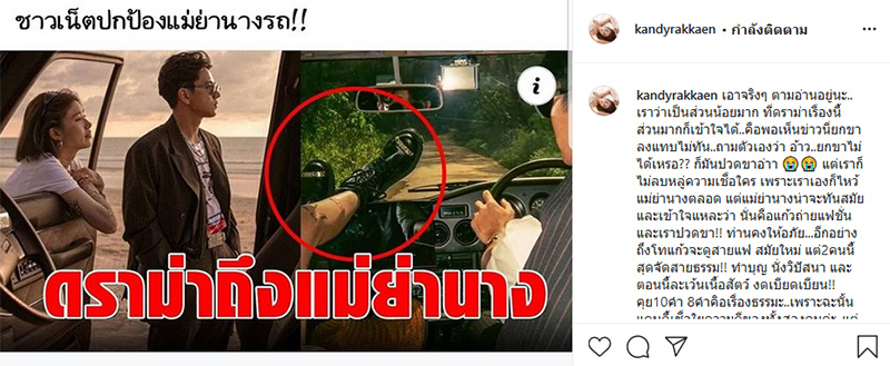 โดยข้อความทั้งหมดระบุว่า "เอาจริง ๆ ตามอ่านอยู่นะ เราว่าเป็นส่วนน้อยมากที่ดราม่าเรื่องนี้ ส่วนมากก็เข้าใจได้ คือพอเห็นข่าวนี่ยกขาลงแทบไม่ทัน ถามตัวเองว่า อ้าว ยกขาไม่ได้เหรอ ?? ก็มันปวดขาอ่าา แต่เราก็ไม่ลบหลู่ความเชื่อใคร เพราะเราเองก็ไหว้แม่ย่านางตลอด แต่แม่ย่านางน่าจะทันสมัยและเข้าใจแหละว่านั่นคือแก้วถ่ายแฟชั่น และเราปวดขา !! ท่านคงให้อภัย