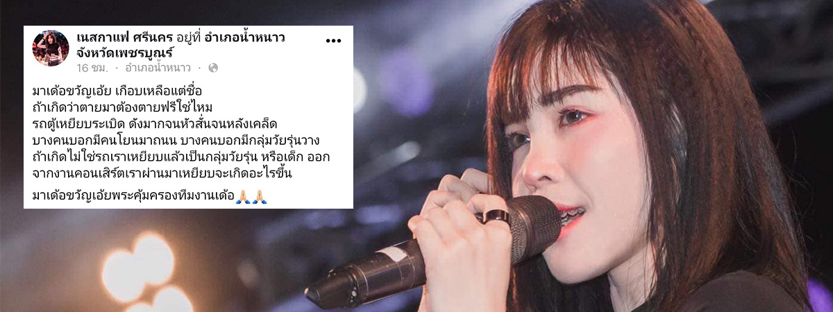 ทำเอานักร้องลูกทุ่งสาว เนสกาแฟ ศรีนคร เกือบเหลือแต่ชื่อ หลังจากรถตู้ที่นั่งมาไปเหยียบกับระเบิด โดยเจ้าตัวเล่าเหตุการณ์ที่เกิดขึ้นผ่านทางเฟซบุ๊กส่วนตัวว่า ตอนเล่นคอนเสิร์ตในงานที่ อ.น้ำหนาว จ.เพชรบูรณ์ ก็ปกติ ทุกคนเต้นกันสนุกสนาน ไม่มีการตีกัน แต่หลังเลิกงานได้ยินคนบอกว่ามีเสียงระเบิดทำมือดังมาจากถนน ก็ได้แต่ภาวนาให้อย่าโดนใคร สุดท้ายโดนกับตัวเอง รถตู้เหยียบระเบิดเสียงดังมากจนหัวสั่นและหลังเคล็ด