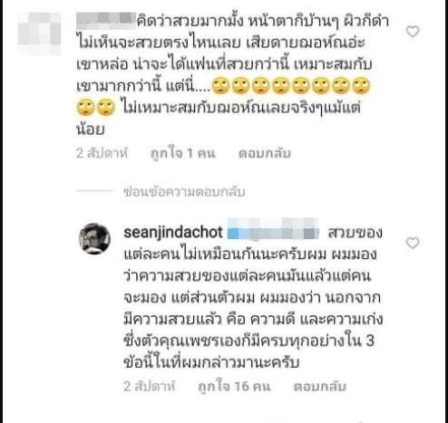 งานนี้ทำเอา ฌอห์ณ จินดาโชติ ทนไม่ไหว ถึงกับต้องออกโรงป้อง เข้าไปคอมเมนต์ตอบกลับชาวเน็ตรายดังกล่าวว่า ความสวยของแต่ละคนไม่เหมือนกัน และต่างคนต่างมุมมอง อีกทั้งแฟนตัวเองก็ไม่ได้มีดีแค่ความสวย