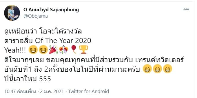 โอ อนุชิต โพสต์ดีใจ ได้รางวัล ดาราสลิ่ม Of The Year 2020 หลังติดเทรนด์ทวิตเตอร์อันดับ 1 ถึง 2 รอบ บอกปีนี้เอาใหม่