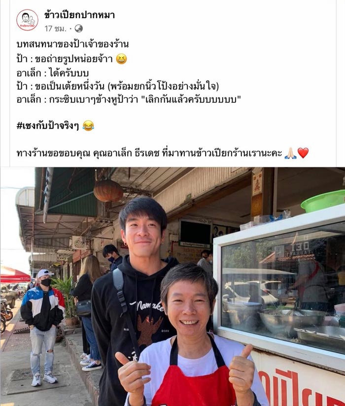 โดยทางเพจเผยว่า คุณป้าได้ขอถ่ายรูปกับ หนุ่มอาเล็ก และยังพูดว่า "ขอเป็นเต้ยหนึ่งวัน" แถมยังยกนิ้วโป้งให้อย่างมั่นใจ ทำเอาพระเอกหนุ่มถึงกับกระซิบข้างหูป้าเบา ๆ ว่า "เลิกกันแล้วครับบบบบบบ" จนแอดมินเพจร้านทิ้งท้ายไว้ว่า เซ็งกับป้าจริง ๆ พร้อมทั้งขอบคุณที่ หนุ่มอาเล็ก มาอุดหนุนอาหารที่ร้านด้วย