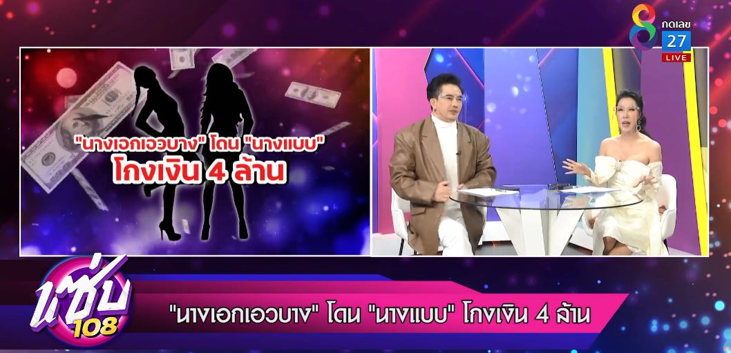 เอิ๊ก : คือเรื่องของเรื่อง นางแบบเข้าไปคุยกับนางเอกว่าจะทำธุรกิจกัน วาดฝันกันสวยหรูเลยค่ะ ว่าเป็นธุรกิจเกี่ยวกับความสวยความงาม เดี๋ยวมาลงทุนกันนะ กำไรดีคนละ 4 ล้าน ว่าเดี๋ยวจะได้กำไรนู่นนี่นั่น เดี๋ยวจะทำกันดีเลย จะช่วยกันโปรโมต เพราะด้วยความสนิทใจนางเอกก็ยอมลงทุนด้วย ควักเงินเก็บมาลงไปคนละ 4 ล้าน ก็เป็น 8 ล้าน แล้วหลังจากนั้นเป็นไงคะ ?