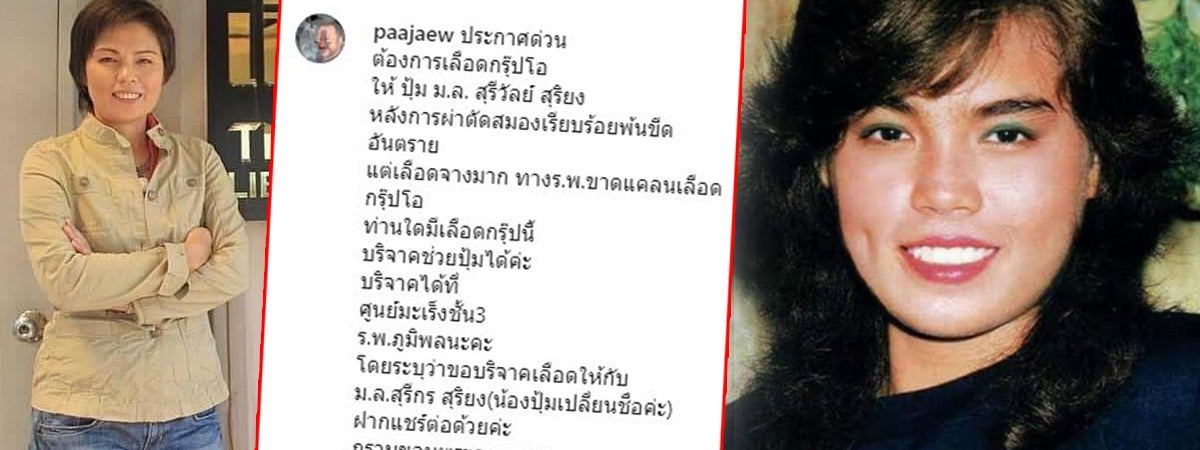 วันที่ 13 มกราคม 2564 ป้าแจ๋ว ยุทธนา ผู้กำกับละครชื่อดัง มีการโพสต์อินสตาแกรม paajaew ประกาศด่วนขอให้คนช่วยบริจาคเลือดกรุ๊ปโอให้แก่ ปุ้ม ม.ล.สุรีวัลย์ สุริยง ราชินีหนังบู๊ของไทย หลังจากผ่าตัดสมองจากอาการเลือดซึม ตอนนี้พ้นขีดอันตราย แต่เลือดจางมาก
