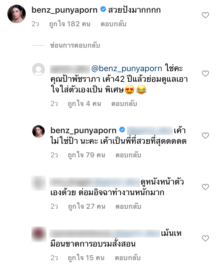 ต่อมา เบนซ์ ปุณยาพร ตอบกลับไปว่า "เค้าไม่ใช่ป้านะคะ เค้าเป็นพี่ที่สวยที่สุด" จากนั้นไอจีดังกล่าวก็พิมพ์มาว่า "เวลาคุณอั้มถ่าย Story ถ่ายให้เห็นหน้าสดของคุณอั้มบ้างก็ดีนะ ไม่อยากเห็นแค่สุนัข ดอกไม้ เพราะเจออั้มโดยบังเอิญ ทำไมไม่สวยเหมือนรูปที่โพสต์ลงใน IG เลย ผิดหวัง"