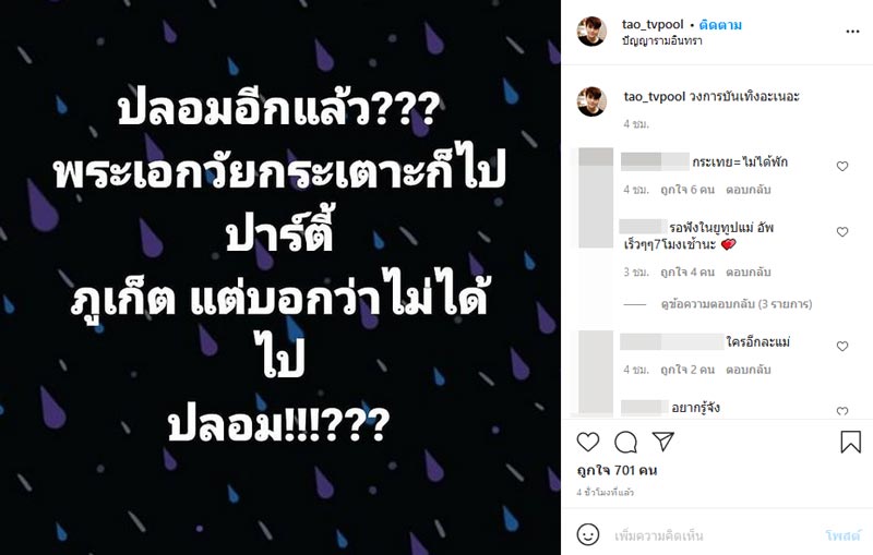 โดย เต๋า ทีวีพูล ได้โพสต์ข้อความผ่านอินสตาแกรมส่วนตัวว่า "ปลอมอีกแล้ว ??? พระเอกวัยกระเตาะก็ไปปาร์ตี้ ภูเก็ต แต่บอกว่าไม่ได้ไป ปลอม !!!???" พร้อมระบุแคปชั่นว่า "....วงการบันเทิงอะเนอะ..."