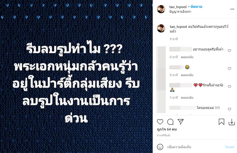 ต่อมาเต๋ายังออกมาโพสต์อีก 1 ข้อความว่า "รีบลบรูปทำไม ??? พระเอกหนุ่มกลัวคนรู้ว่าอยู่ในปาร์ตี้กลุ่มเสี่ยง รีบลบรูปในงานเป็นการด่วน" และระบุแคปชั่นว่า "ลบไม่ทันแล้วเพราะกูแคปไว้แล้ว"