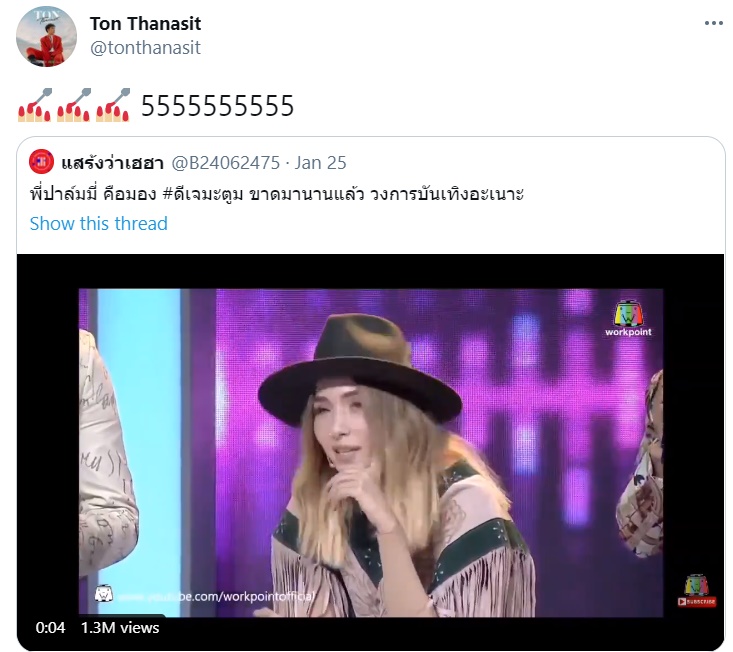 ถูกนำกลับมาแชร์สนั่นโซเชียล สำหรับคลิปตอนที่ ดีเจมะตูม ไปออกรายการ I Can See Your Voice Thailand ซึ่งมีนักร้องรับเชิญคือ ปาล์มมี่ โดยหนึ่งในคนที่แชร์คลิปดังกล่าวคือนักร้องหนุ่ม ต้น ธนษิต หรือ ต้น AF8 ซึ่งโพสต์เป็นอีโมติคอนรูปทาสีเล็บ และ "5555555555" จากนั้นก็ยังทวีตข้อความอีกว่า "หุหุ ไม่พูดละกัน นั่งยิ้มอยู่เฉย ๆ ไกล ๆ :)"