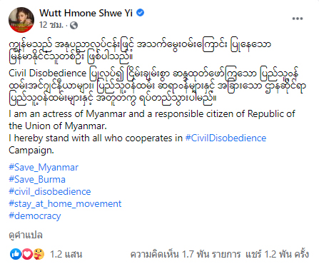 "ฉันเป็นนักแสดงหญิงชาวเมียนมา และเป็นพลเมืองที่รับผิดชอบของสาธารณรัฐแห่งสหภาพเมียนมา ฉันขอยืนหยัดเคียงข้างทุก ๆ คนที่ร่วมมือในแคมเปญ #CivilDisobedience "