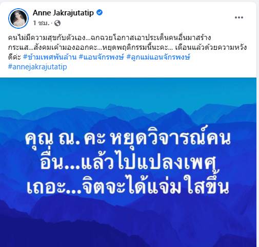 ต่อมา แอน จักรพงษ์ ได้ออกมาโพสต์ข้อความผ่านเฟซบุ๊ก Anne Jakrajutatip ระบุว่า "คนไม่มีความสุขกับตัวเอง...ฉกฉวยโอกาสเอาประเด็นคนอื่นมาสร้างกระแส...สังคมเขามองออกค่ะ...หยุดพฤติกรรมนี้นะคะ... เตือนแล้วด้วยความหวังดีค่ะ #ข้ามเพศพันล้าน #แอนจักรพงษ์ #ลูกแม่แอนจักรพงษ์ #annejakrajutatip"