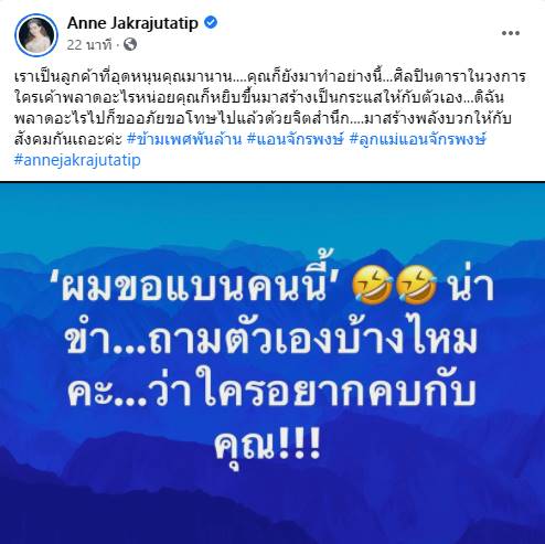 "เราเป็นลูกค้าที่อุดหนุนคุณมานาน....คุณก็ยังมาทำอย่างนี้...ศิลปินดาราในวงการใครเค้าพลาดอะไรหน่อยคุณก็หยิบขึ้นมาสร้างเป็นกระแสให้กับตัวเอง...ดิฉันพลาดอะไรไปก็ขออภัย ขอโทษไปแล้วด้วยจิตสำนึก....มาสร้างพลังบวกให้กับสังคมกันเถอะค่ะ #ข้ามเพศพันล้าน #แอนจักรพงษ์ #ลูกแม่แอนจักรพงษ์ #annejakrajutatip"