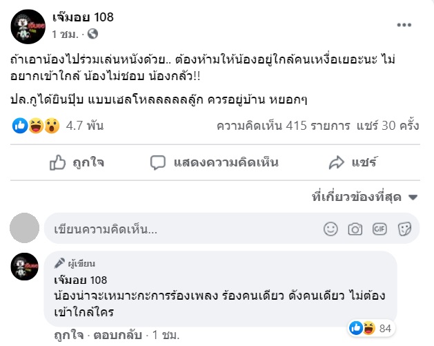 ทำเอาขาเผือกถึงกับหูผึ่งปูเสื่อรอ เมื่อล่าสุด (8 มีนาคม 2564) เพจเฟซบุ๊ก เจ๊มอย 108 โพสต์ทิ้งปริศนาเมาท์ดารารุ่นน้องคนหนึ่งว่า "ถ้าเอาน้องไปร่วมเล่นหนังด้วย.. ต้องห้ามให้น้องอยู่ใกล้คนเหงื่อเยอะนะ ไม่อยากเข้าใกล้ น้องไม่ชอบ น้องกลัว !! ป.ล. กูได้ยินปุ๊บ แบบเฮลโหลลลลลลู๊ก ควรอยู่บ้าน หยอก ๆ"