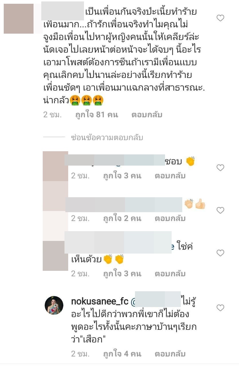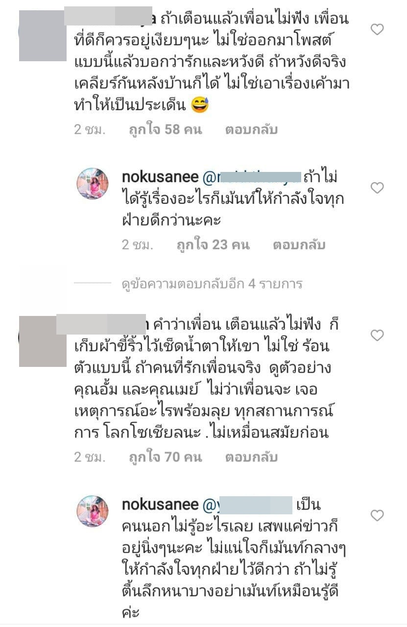 ทั้งนี้ ได้มีหลายคนเข้ามาคอมเมนต์ติติงการกระทำของสาว นก อุษณีย์ ในครั้งนี้ว่าไม่เหมาะสมเท่าไรนัก หากเตือนแล้วเพื่อนไม่ฟังก็ควรอยู่เงียบ ๆ รอปลอบตอนเสียใจ ไม่ใช่ออกมาโพสต์แบบนี้แล้วบอกว่ารักและหวังดี เรื่องแบบนี้เคลียร์กันหลังบ้านก็ได้ การกระทำแบบนี้เหมือนเป็นการทำร้ายเพื่อนมากกว่า