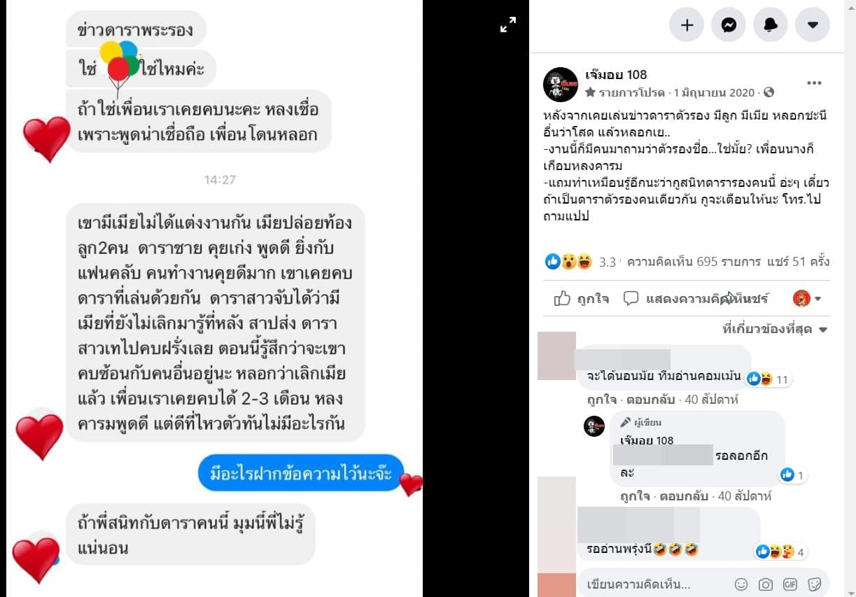งานนี้ก็มีคนขุดโพสต์ของเพจดังกล่าวที่เคยโพสต์ถึงเรื่องนี้ แฉถึงดาราตัวรองมาอ่อยผู้หญิง มีเมียมา 6 ปี แต่ชอบบอกสาว ๆ ว่าโสด ด้วยความเป็นดารา สาว ๆ บางคนก็เข้าหาเพราะหลงคารม พร้อมมีแชตที่คุยกับสาวที่โดนอ่อยด้วย