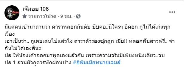 ล่าสุด (13 มีนาคม 2564) เจ๊มอย 108 เพจเมาท์ดาราชื่อดัง ก็ออกมาโพสต์เกี่ยวกับเรื่องนี้ หลังมีคนถามเข้ามากันเยอะว่าเป็นใคร โดยระบุว่า "มีแต่คนเข้ามาถามว่า ดาราหลอกกินตับ บีบคอ..นี่ใคร ๆ อิดอก กูไม่ได้เก่งทุกเรื่อง เอาเป็นว่า.. กูเคยเล่นไปแล้วไง ดาราตัวรองซุกลูก เมีย !! หลอกฟันสาวฟรี.. จำกันไม่ได้เองสินะ ป.ล. ให้น้องเค้าออกมาพูดเองแล้วกัน เพราะความจริงมีเพียงหนึ่งเดียว..จบ ป.ล.1 ส่วนผัวกูควรพักผ่อนบ้าง #อิพิมเมียทนายเจมส์"