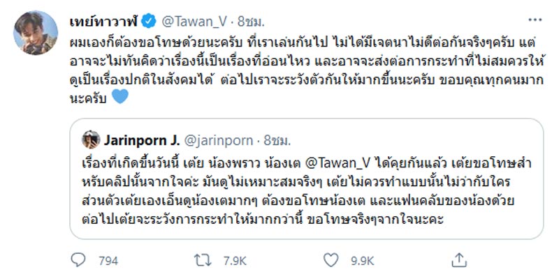 อย่างไรก็ตาม ในเวลาต่อมา เต้ย จรินทร์พร ได้ออกมาโพสต์ข้อความขอโทษผ่านทวิตเตอร์ส่วนตัวแล้วว่า "เรื่องที่เกิดขึ้นวันนี้ เต้ย น้องพราว น้องเต @Tawan_V ได้คุยกันแล้ว เต้ยขอโทษสำหรับคลิปนั้นจากใจค่ะ มันดูไม่เหมาะสมจริง ๆ เต้ยไม่ควรทำแบบนั้นไม่ว่ากับใคร ส่วนตัวเต้ยเองเอ็นดูน้องเตมาก ๆ ต้องขอโทษน้องเต และแฟนคลับของน้องด้วย ต่อไปเต้ยจะระวังการกระทำให้มากกว่านี้ ขอโทษจริง ๆ จากใจนะคะ" ซึ่งก็มีแฟน ๆ เข้าไปคอมเมนต์ขอบคุณที่ออกมาชี้แจง พร้อมเสริมว่า ถึงเอ็นดูและสนิทกันยังไงก็ไม่ควรทำ