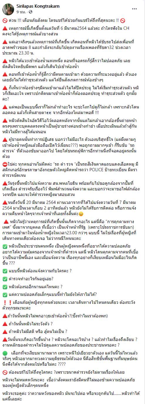 วันที่ 19 มีนาคม 2564 หมิว สิริลภัส นักแสดงชื่อดัง ได้โพสต์คลิปวิดีโอผ่านเฟซบุ๊กส่วนตัว Sirilapas Kongtrakarn ซึ่งเป็นเหตุการณ์ที่เธอถ่ายไว้ขณะเข้าห้องน้ำปั๊มน้ำมันแห่งหนึ่ง โดยถือกล้องออกมาและพูดคุยกับชายคนหนึ่งว่าตามเข้ามาในห้องน้ำทำไม แถมถือโทรศัพท์เหมือนจะถ่ายภาพเธอด้วย โดยที่อีกฝ่ายยืนยันว่าบริสุทธิ์ใจ สามารถดูโทรศัพท์ได้เลย ก่อนที่ชายคนดังกล่าวจะปิดประตูรถ ซึ่งหมิวได้ตะโกนให้บุคคลที่อยู่ในบริเวณใกล้กันได้ยินว่าคนคนนี้เข้าห้องน้ำหญิง และขับรถตำรวจมา พร้อมกับจดทะเบียนรถไว้ แถมยังชนรถคนอื่นด้วย