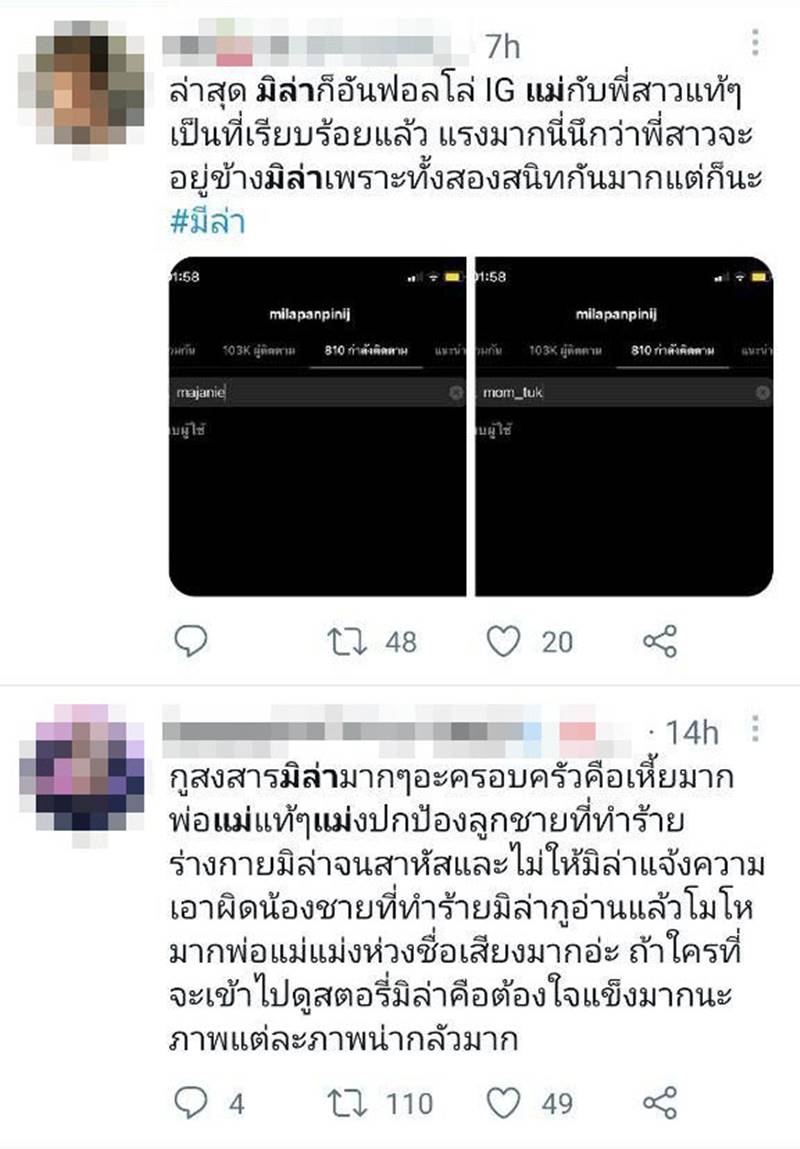 เกี่ยวกับเรื่องนี้ วันที่ 14 เมษายน 2564 หลังจากที่ มีล่า ออกมาโพสต์ไอจีสตอรี่ว่าถูกน้องชายทำร้าย และเล่าเรื่องทั้งหมด ปรากฏว่าพี่สาวและแม่ได้อันฟอลโลว์อินสตาแกรมของเจ้าตัวไปแล้ว ซึ่งเธอเองก็ไม่ได้ฟอลโลว์ทั้งคู่เช่นกัน