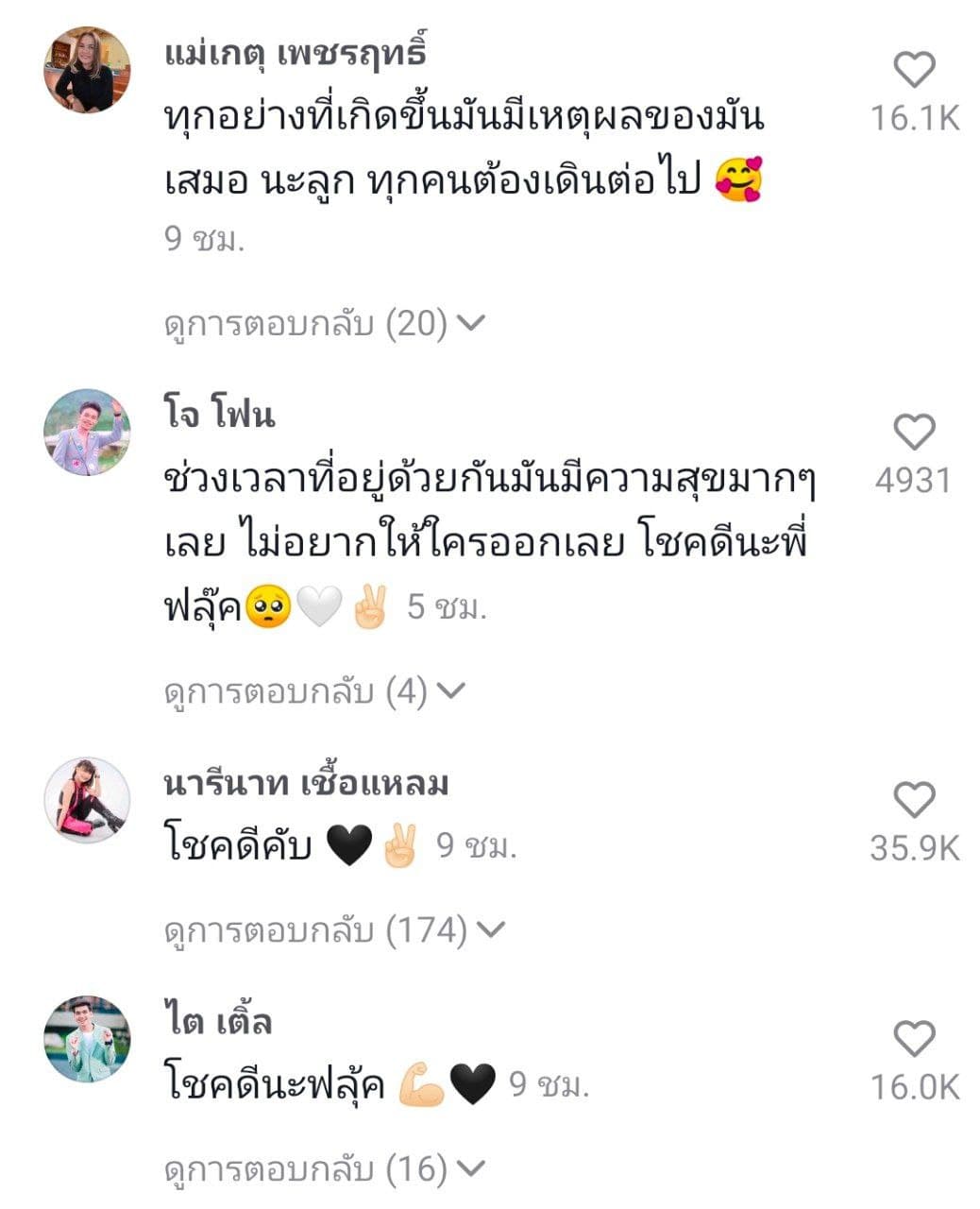 งานนี้ แม่เกตุ คุณแม่ของ เจนนี่ ลิลลี่ ก็เข้ามาคอมเมนต์ว่า "ทุกอย่างที่เกิดขึ้นมันมีเหตุผลของมันเสมอนะลูก ทุกคนต้องเดินต่อไป" ขณะที่ลิลลี่ ก็มาคอมเมนต์แบบสั้น ๆ ว่า "โชคดีคับ"