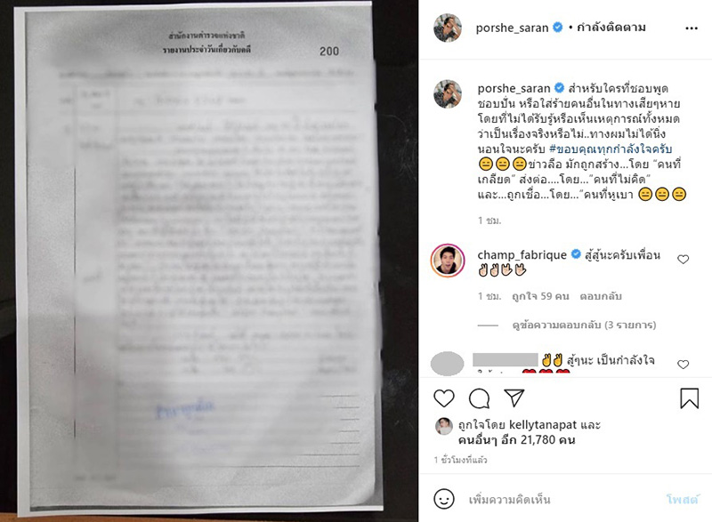 ต่อมา พอร์ช ศรัณย์ ได้โพสต์ภาพเอกสารบันทึกประจำวันผ่านทางอินสตาแกรม พร้อมเขียนแคปชั่นระบุว่า "สำหรับใครที่ชอบพูด ชอบปั่น หรือใส่ร้ายคนอื่นในทางเสีย ๆ หาย ๆ โดยที่ไม่ได้รับรู้หรือเห็นเหตุการณ์ทั้งหมดว่าเป็นเรื่องจริงหรือไม่.. ทางผมไม่ได้นิ่งนอนใจนะครับ #ขอบคุณทุกกำลังใจครับ ข่าวลือมักถูกสร้างโดยคนที่เกลียด ส่งต่อโดยคนที่ไม่คิด และถูกเชื่อโดยคนที่หูเบา"