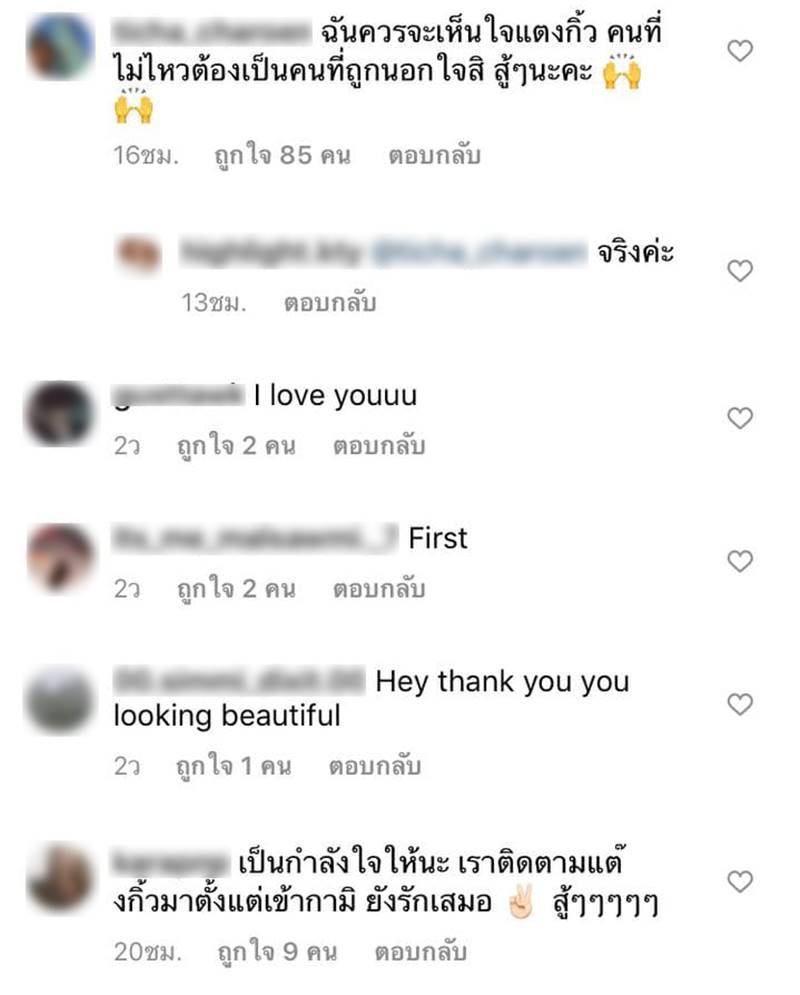 อย่างไรก็ตาม พบว่าชาวเน็ตหลายคนพากันเข้าไปคอมเมนต์เป็นกำลังใจให้แต้งกิ้ว เนื่องจากมองว่าเป็นฝ่ายถูกกระทำ เป็นคนที่น่าจะเสียใจมากที่สุด คนที่ไม่ไหวน่าจะเป็นแต้งกิ้วมากกว่าที่ถูกนอกใจ