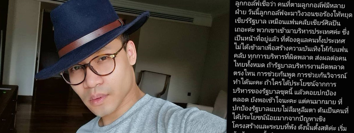 พร้อมโพสต์ภาพที่เขียนข้อความวิงวอนขอให้หยุดเชียร์รัฐบาลเหมือนแฟนคลับเชียร์ศิลปิน ระบุว่า "ลูกกอล์ฟเชื่อว่า คนที่ตามลูกกอล์ฟมีหลายฝ่าย วันนี้ลูกกอล์ฟจะมาวิงวอนขอร้องให้หยุดเชียร์รัฐบาล เหมือนแฟนคลับเชียร์ศิลปินเถอะค่ะ พวกเขาเข้ามาบริหารประเทศค่ะ ซึ่งเป็นหน้าที่อยู่แล้วที่ต้องดูแลคนทั้งประเทศ ไม่ได้เข้ามาเพื่อสร้างความบันเทิงให้กับแฟนคลับ