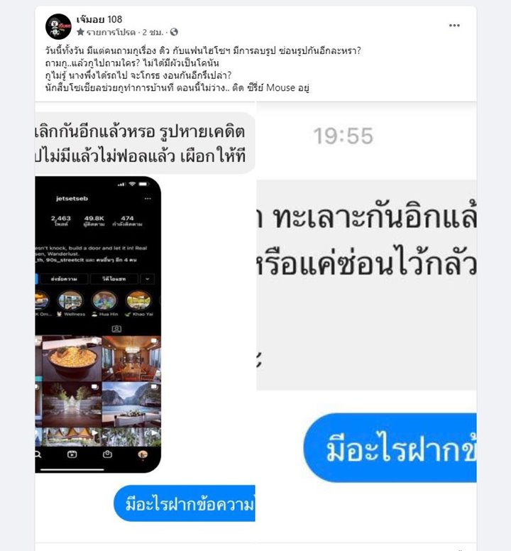 โดยทางเพจ เจ๊มอย 108 ได้โพสต์ถึงเรื่องนี้ว่า "วันนี้ทั้งวัน มีแต่คนถามกูเรื่อง ดิว กับแฟนไฮโซฯ มีการลบรูป ซ่อนรูปกันอีกละหรา ? ถามกู..แล้วกูไปถามใคร ? ไม่ได้มีผัวเป็นโคนัน กูไม่รู้ นางพึ่งได้รถไป จะโกรธ งอนกันอีกรึเปล่า ? นักสืบโซเชียลช่วยกูทำการบ้านที ตอนนี้ไม่ว่าง.. ติด ซีรี่ส์ Mouse อยู่"