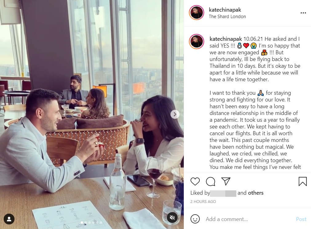 ทางด้านสาว เกศ จิณภัค ก็ได้เผยภาพโมเมนต์สุดประทับใจนี้ลงใน IG ด้วยเช่นกัน เปิดใจสุดยินดีที่ได้หมั้นกับแฟนหนุ่มแล้ว แม้จะต้องบินกลับไทยใน 10 วัน แต่ยังโอเคที่หลังจากนี้จะได้ใช้ชีวิตคู่อยู่ด้วยกันแล้ว ซึ่งก็มีเพื่อน ๆ และแฟน ๆ เข้ามาร่วมแสดงความยินดีกันเป็นจำนวนมาก