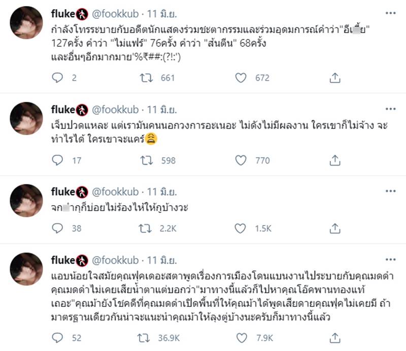 ล่าสุด (13 มิถุนายน 2564) กลายเป็นเรื่องร้อนแรงขึ้นมาทันที เมื่อหนุ่ม ฟลุค พชร หรือ ฟลุค เดอะสตาร์ 5 ทวีตข้อความอย่างดุเดือดถึงเรื่องนี้ เริ่มจากแชร์ข่าวที่มดดำร้องไห้พร้อมข้อความว่า “อ่านไม่จบ อ่านแล้วจะอ้วก”