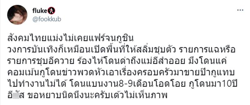 ฟลุคยังโพสต์เดือดอีกว่า นี่รายการแฉหรือรายการชุบ ม้า อรนภา โดนด่าแค่ในคอมเมนต์ แต่สำหรับตนโดนพาดหัวข่าวเอาเรื่องครอบครัวมาขาย พ่อแทบไปทำงานไม่ได้ ม้าโดนแบนงาน 8-9 เดือนทำเป็นโอดโอย แต่ตนโดนมาเป็น 10 ปี