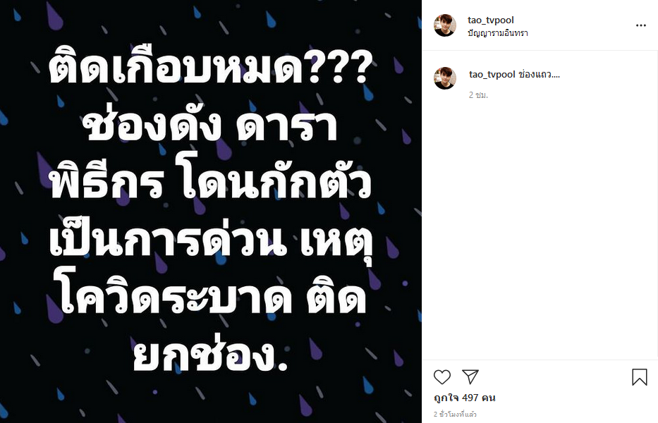 โดย เต๋า ทีวีพูล ได้โพสต์ข้อความระบุว่า "ติดเกือบหมด ??? ช่องดัง ดารา พิธีกร โดนกักตัวเป็นการด่วน เหตุโควิดระบาด ติดยกช่อง" และยังได้เขียนแคปชั่นไว้อีกว่า "ช่องแถว...."