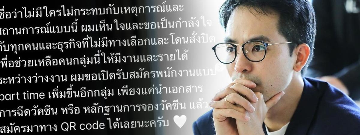 ท็อป ณัฐเศรษฐ์ ประกาศเปิดรับสมัครพนักงานพาร์ตไทม์เพิ่ม ช่วยเหลือคนที่ตกงานจากผลกระทบของ โควิด 19 หลังเคยเปิดรับสมัครพนักงานประจำมาแล้ว