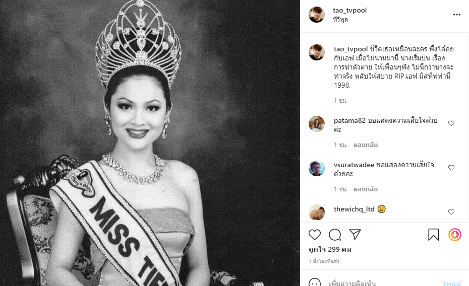 ด้านนักข่าวบันเทิงชื่อดังอย่าง เต๋า ทีวีพูล ก็ได้โพสต์อาลัยด้วยเช่นกันว่า "ชีวิตเธอเหมือนละคร เพิ่งได้คุยกับเอฟเมื่อไม่นานมานี้ นางเริ่มบ่นเรื่องการฆ่าตัวตายให้เพื่อน ๆ ฟัง ไม่นึกว่านางจะทำจริง หลับให้สบาย RIP เอฟ มิสทิฟฟานี่ 1998"