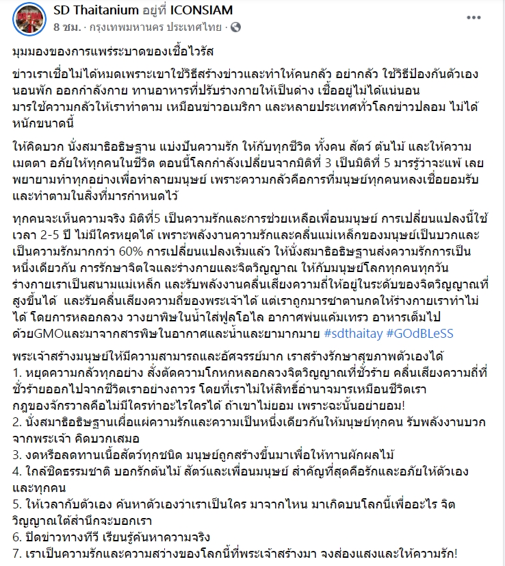 ให้คิดบวก นั่งสมาธิอธิษฐาน แบ่งปันความรัก ให้กับทุกชีวิต ทั้งคน สัตว์ ต้นไม้ และให้ความเมตตา อภัยให้ทุกคนในชีวิต ตอนนี้โลกกำลังเปลี่ยนจากมิติที่ 3 เป็นมิติที่ 5 มารรู้ว่าจะแพ้ เลยพยายามทำทุกอย่างเพื่อทำลายมนุษย์ เพราะความกลัวคือการที่มนุษย์ทุกคนหลงเชื่อยอมรับและทำตามในสิ่งที่มารกำหนดไว้