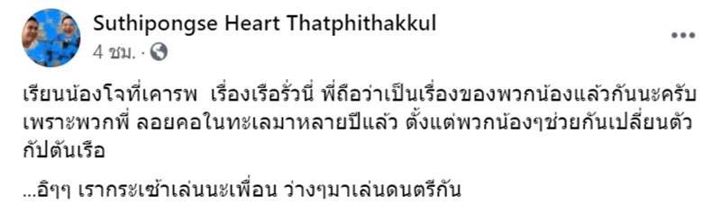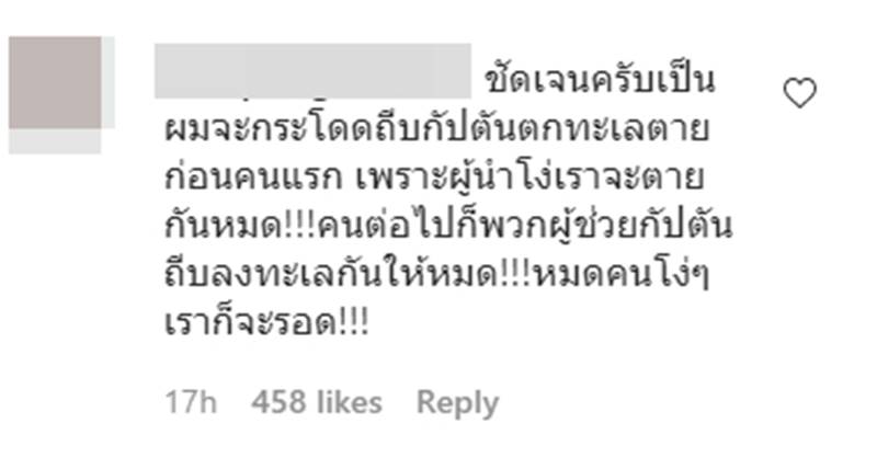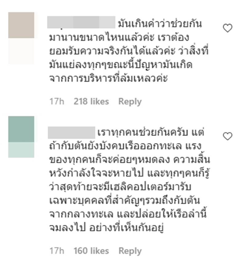 โพสต์ดังกล่าวทำให้หลายคนพากันเข้าไปแสดงความคิดเห็นมากมาย เกี่ยวกับเรื่องเรือที่มีรอยรั่วนี้ ชี้ว่าอยากให้มองโลกความเป็นจริงและยอมรับความจริงได้แล้วว่าสาเหตุเกิดจากอะไร กัปตันเรือที่ไม่มีความรู้ มุ่งแต่จะไปในทางที่ผิด และยังดื้อไม่ยอมรับฟัง ในขณะที่ลูกเรือช่วยกันจนสุดแรง สุดท้ายเรือก็จะล่มจมกันไปหมด