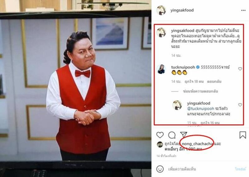 และยิ่งน่าจับตามองเมื่อนักร้องดัง ตั๊ก ศิริพร ภรรยาของ นุ้ย เชิญยิ้ม ได้เข้ามาคอมเมนต์หัวเราะลั่นด้วยว่า "555555555 จารย์" ซึ่งอ.ยิ่งศักดิ์ก็คอมเมนต์ตอบด้วยว่า "ระวังผัวแกนะจะแก่กะโปกกะลาล่ะ" นอกจากนี้ ยังมีตลกชื่อดัง โหน่ง ชะชะช่า พี่ชายของ นุ้ย เชิญยิ้ม เข้ามากดไลก์ด้วย