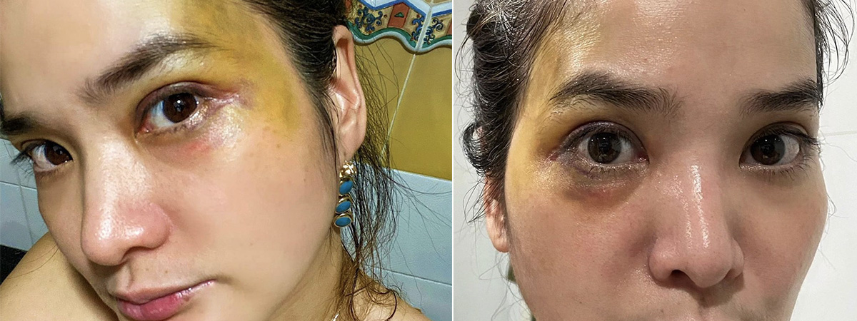 คืนแรกก็ผ่านไปด้วยดี แม้ข้างตาซ้ายจะปวมเป็นทางยาวเหมือนตัวตะขาบทั้งใหญ่และยาว คุณสามีเอาเจลเย็นให้นอนประคบทั้งคืนด้วยความห่วงใย เช้าวันที่ 2 ดีขึ้น แผลยุบลง คงเหลือแต่ความเจ็บไว้ให้รู้สึก เปลือกตาบนเหมือนทาอาเชโด่สีน้ำตาลเข้ม
