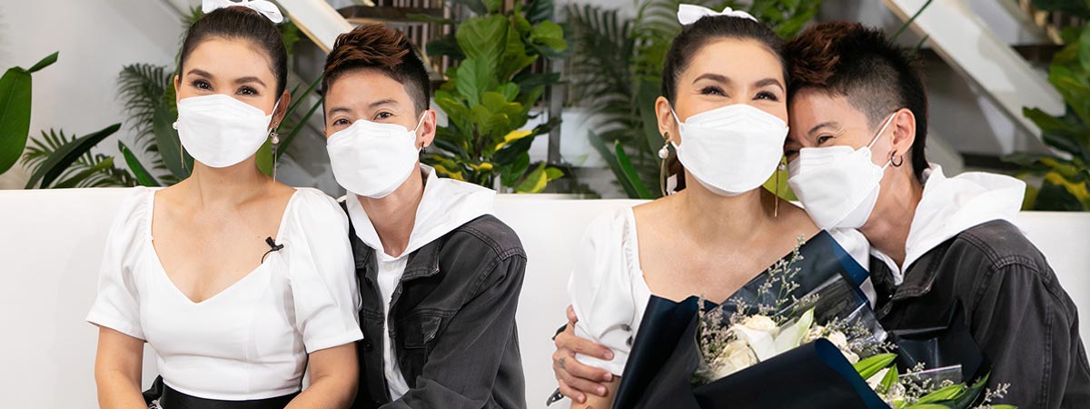 ฝน ธนสุนธร : เพราะว่าเป็นก่อนหน้านี้สังคมยังไม่ยอมรับ พอไม่ยอมรับ เราก็จะไม่พูด เราก็จะอยู่ในที่ของเรา ถามว่าเราดูแลกันมายังไง ก็เป็นมาแบบนี้เกือบ 20 ปี แล้ว แต่ที่ยังไม่พูดเพราะสังคมยังไม่ให้โอกาสเรา และสังคมยังคาดหวังกับเราอยู่ว่า เราจะต้องแบบยังงั้นยังงี้เหมือนที่เขาอยากจะให้เป็น พอไม่เป็นแบบนั้นเขาก็จะผิดหวัง จะไม่เป็นที่นิยม จะเลิกติดตาม แต่ตอนนี้ทุกคนเข้ามาคู่นี้น่ารักอะ ชอบคู่นี้ หลาย ๆ คนบอกว่าคู่นี้เป็นไอดอลให้กับเขา บางคนก็บอกว่าขอบคุณมากเลย ตอนนี้พ่อกับแม่ยอมรับเขาแล้ว