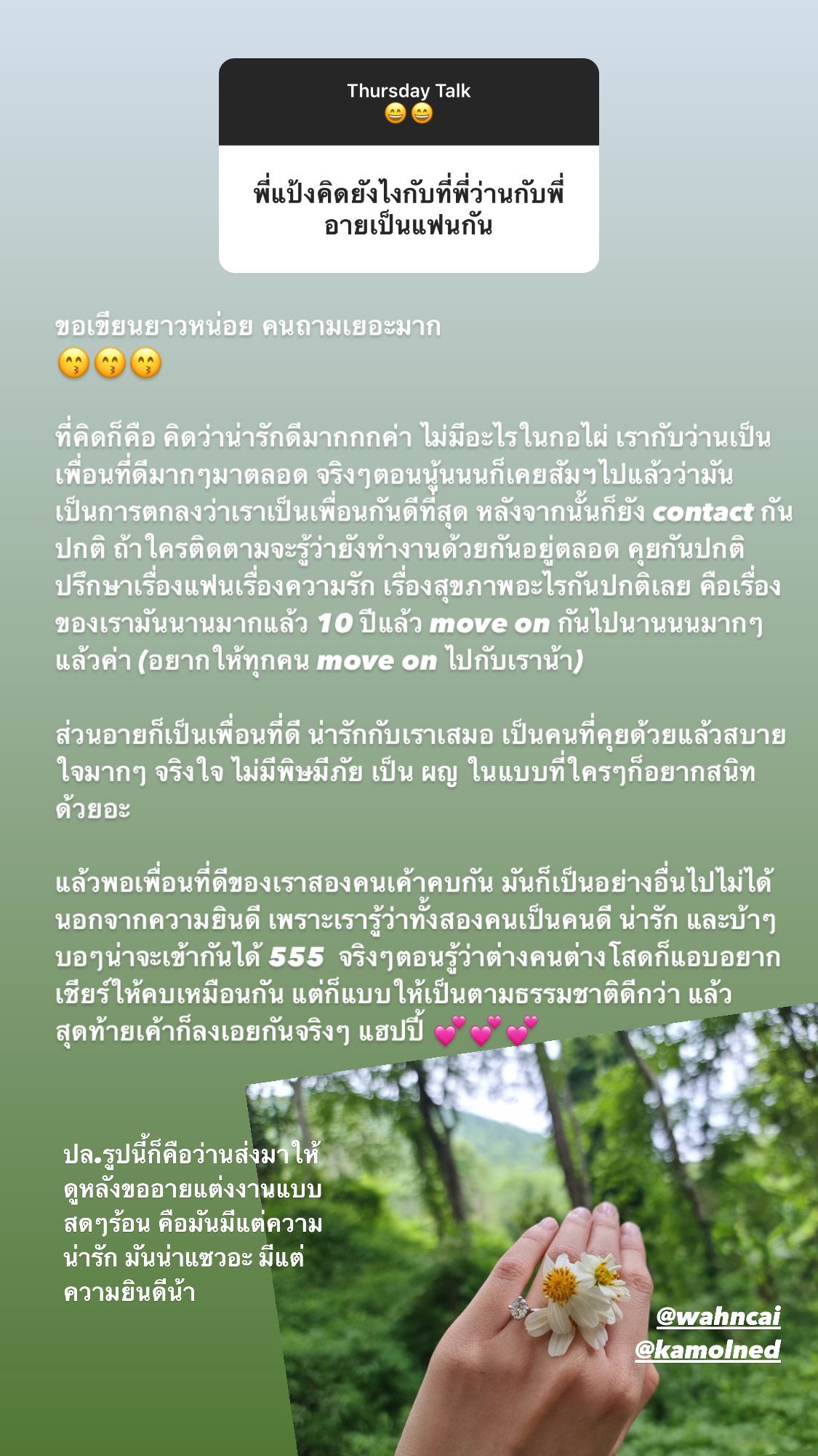 "ขอเขียนยาวหน่อย คนถามเยอะมาก ที่คิดก็คือ คิดว่าน่ารักมากกกค่า ไม่มีอะไรในกอไผ่ เรากับว่านเป็นเพื่อนที่ดีมาก ๆ มาตลอด จริง ๆ ตอนนู้นนนก็เคยสัมฯ ไปแล้วว่ามันเป็นการตกลงว่าเราเป็นเพื่อนกันดีที่สุด หลังจากนั้นก็ยัง contact กันปกติ ถ้าใครติดตามจะรู้ว่ายังทำงานด้วยกันอยู่ตลอด คุยกันปกติ ปรึกษาเรื่องแฟนเรื่องความรัก เรื่องสุขภาพอะไรกันปกติเลย คือเรื่อง ของเรามันนานมากแล้ว 10 ปีแล้ว move on กันไปนานนนมาก ๆ แล้วค่า อยากให้ทุกคน move on ไปกับเราน้า)