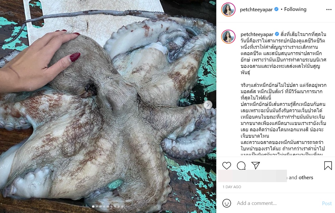 "สิ่งที่เสียใจมากที่สุดในวันนี้คือเราไม่สามารถปกป้องดูแลชีวิตชีวิตหนึ่งที่เราให้คำสัญญาว่าเราจะเลิกทานตลอดชีวิต และสนับสนุนการฆ่าปลาหมึกยักษ์ เพราะว่ามันเป็นการทำลายระบบนิเวศของฉลามและท้องทะเลส่งผลให้มันสูญพันธุ์