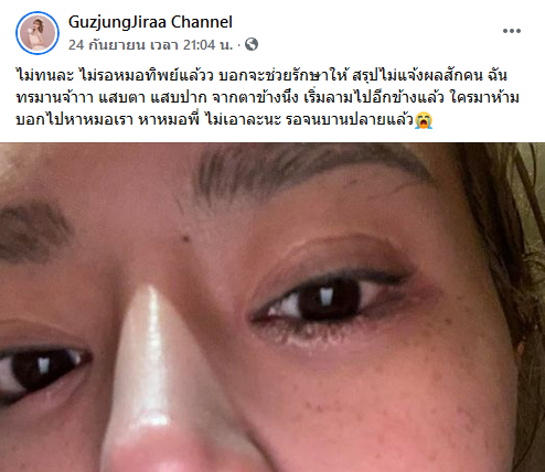 โดยกัสจังยังบอกว่า "ไม่ทนละ ไม่รอหมอทิพย์แล้วว บอกจะช่วยรักษาให้ สรุปไม่แจ้งผลสักคน ฉันทรมานจ้าาา แสบตา แสบปาก จากตาข้างหนึ่ง เริ่มลามไปอีกข้างแล้ว ใครมาห้ามบอกไปหาหมอเรา หาหมอพี่ ไม่เอาละนะ รอจนบานปลายแล้ว"