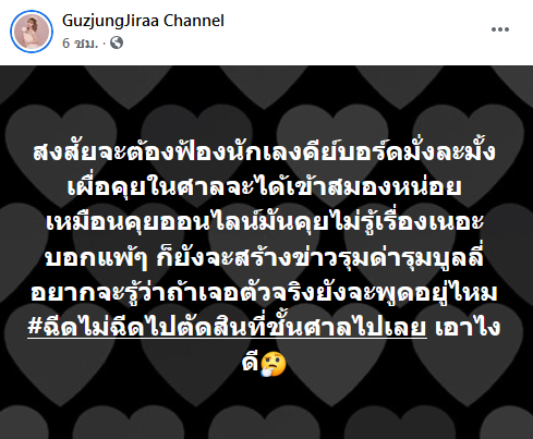 งานนี้ทำเอาสาวกัสจังถึงกับไม่ทนและได้ออกมาโพสต์ว่า "สงสัยจะต้องฟ้องนักเลงคีย์บอร์ดมั่งละมั้ง เผื่อคุยในศาลจะได้เข้าสมองหน่อย เหมือนคุยออนไลน์มันคุยไม่รู้เรื่องเนอะ บอกแพ้ ๆ ก็ยังจะสร้างข่าวรุมด่ารุมบูลลี่ อยากจะรู้ว่าถ้าเจอตัวจริงยังจะพูดอยู่ไหม #ฉีดไม่ฉีดไปตัดสินที่ชั้นศาลไปเลย เอาไง"