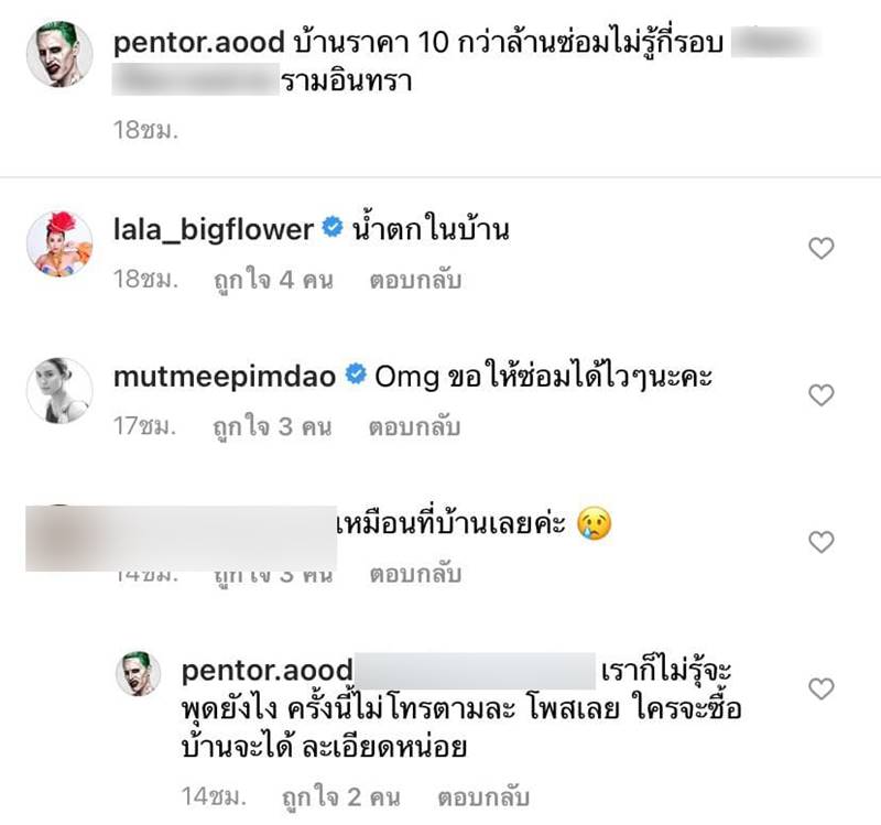 พร้อมกันนั้นยังโพสต์คลิป เผยให้เห็นหลังคาที่มีน้ำรั่วลงมาจากเพดาน ไหลหนักราวกับน้ำตกกลางบ้าน จนคนในบ้านต้องช่วยกันเข้ามาซับน้ำที่ไหลนองอยู่เต็มพื้น